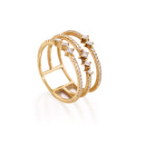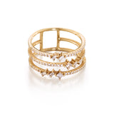 A delightful balance of princess, baguette and round cut petite diamonds set in this trio band making the ring whimsical yet an eye-catching classic jewelry piece.