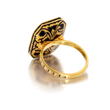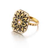 Inspired by the strength and beauty of the lotus flower, the Meena Diamond Lotus ring is handcrafted in Jaipur, India by Madhuri's talented artisans, using ancient Indian enameling technique called Meena to paint the lotus flower in the designer's signature black and gold Meena enamel. A petite diamond is bezzle set in the center of the design to create a sense of unity. On the inside of the ring, there is a magnificent meena design that celebrates the wearer's inner-beauty.